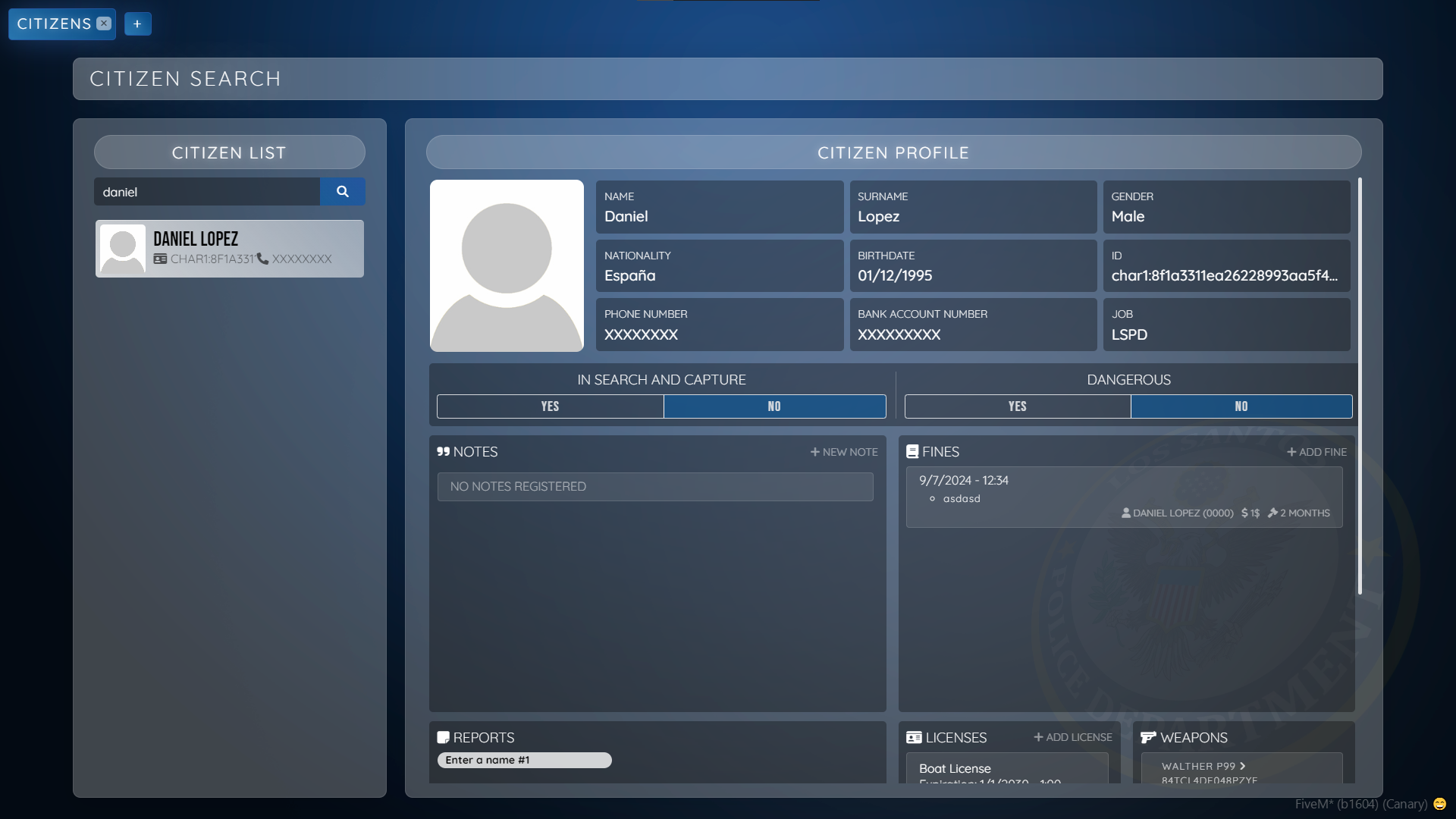 We are going to divide this part into 10 different parts: citizen info, search & capture, dangerous, notes, fines, reports, licenses, weapons, vehicles and properties.