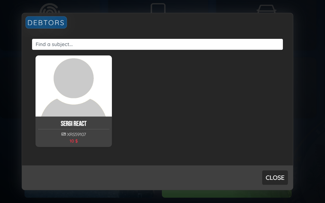 The entire list of users who have pending unpaid fines will be displayed, below their citizen ID the amount they have pending to pay at the police station will be displayed.